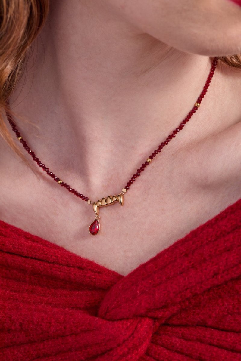Dare to make a statement with this bold cuff bracelet that channels dark allure. Sculpted vampire fangs pair with a striking crimson teardrop charm, creating an accessory that's equal parts mysterious and daring. Crafted from garnet-hued glass beads and gold-plated brass, it features a faceted siam crystal drop that catches the light with every move. Perfect for those who embrace unconventional style and aren't afraid to stand out.